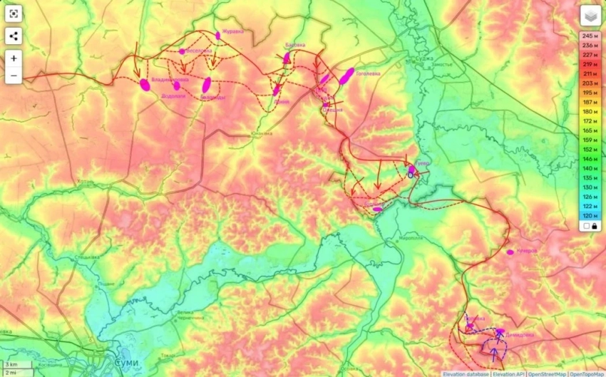 Автор отмечает, что южная часть Локни плавно переходит в село Юнаковка - главную промежуточную цель наступления. Контроль над высотами вокруг Юнаковки позволит нам работать FPV-дронами по Сумам.