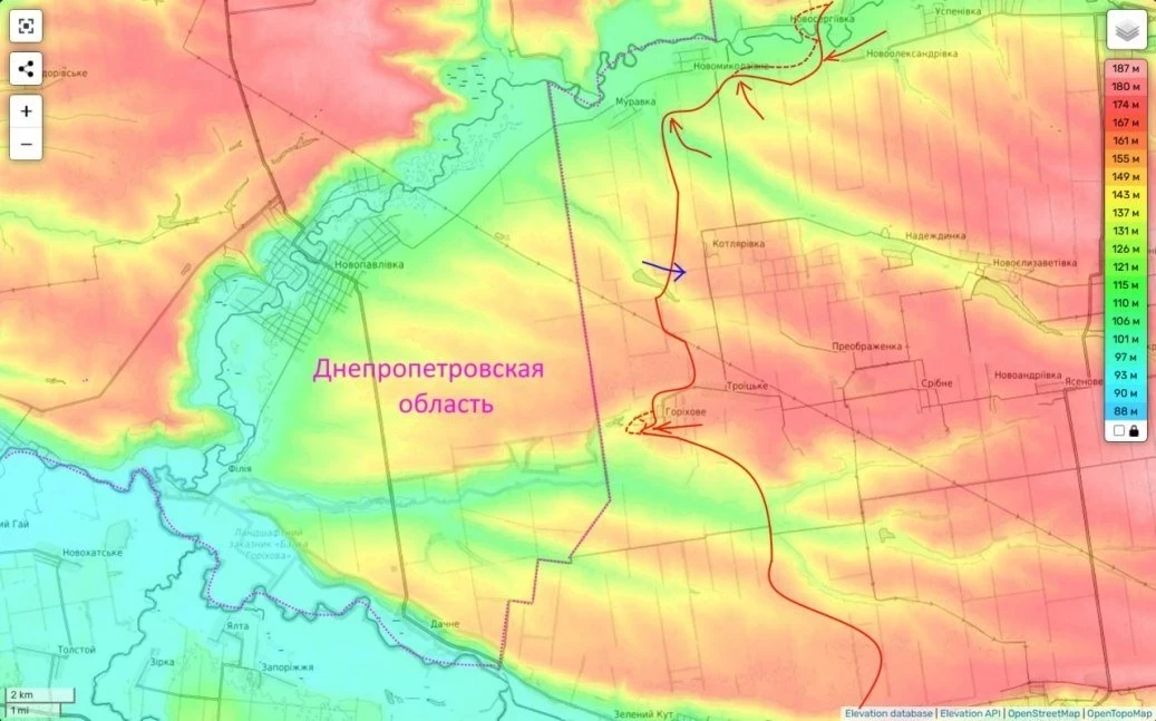 Он также сообщил, что на некоторых участках фронта российские войска находятся на расстоянии всего полутора километров от границы с Днепропетровской областью.