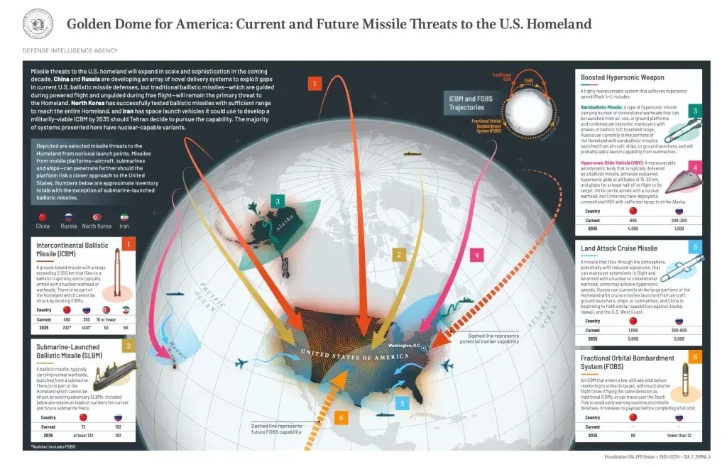 Разведывательное управление Министерства обороны США (DIA) на прошлой неделе опубликовало несекретную оценку под названием «Золотой купол для Америки: текущие и будущие ракетные угрозы для территории США», в которой описываются угрозы, от которых должна защищать сложная система противоракетной обороны Соединённых Штатов. Угрозы исходят от баллистических, крылатых ракет большой дальности и гиперзвуковых ракет, запускаемых с воздуха, земли и подводных лодок.