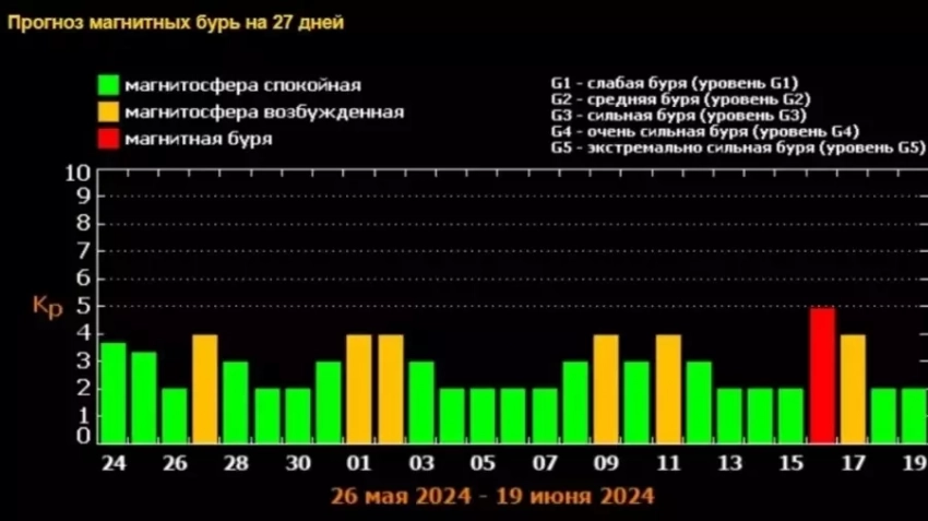 В воскресенье, 26 мая, с 07:00 до 10:00 прогнозируется ощутимая геомагнитная буря (4 балла), с 10:00 до 13:00 и с 16:00 до 19:00 - слабая. В остальные часы ожидаются небольшие возмущения (2 балла).