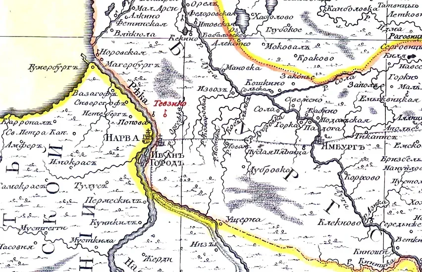 В селении Тявзино близ Ивангорода и Нарвы 18 (28) мая 1595 года был подписан Тявзинский мирный договор, который завершил русско-шведскую войну 1590—1595 годов. Фрагмент Карты Санкт-Петербургской губернии содержащая Ингерманландию, часть Новгородской и Выборгской губернии сочинения Я.Ф.Шмита. 1770 года с выделением селения Тявзино.
