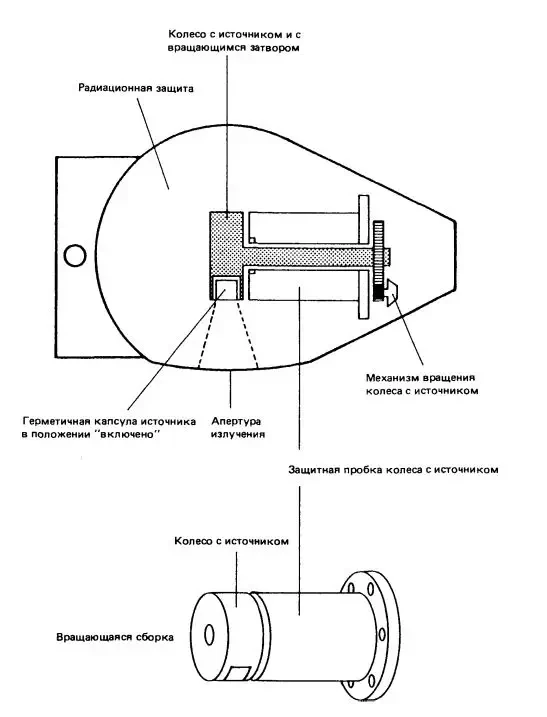 Капсула с радиоактивным веществом размещена на колесе источника, изготовленном из свинца и нержавеющей стали, образуя механизм с вращающимся затвором. Для выхода излучения наружу производится вращение затвора электромотором, с тем чтобы совместить капсулу с аппаратурой излучения — отверстием выхода пучка. Между вращающимся затвором и приводом электромотора находится цилиндрическая защитная пробка. Эти элементы в целом называются вращающейся сборкой.