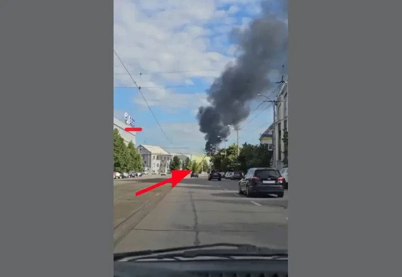 Автомобиль с видеорегистратором движется по Соборному проспекту - на подъезде к основному зданию автозавода (слева). Далее с учётом искривления проспекта вправо (перед транспортным кольцом) - дым поднимается над цеховым комплексом ЗАЗа, где противник в последнее время сосредоточил военное производство.