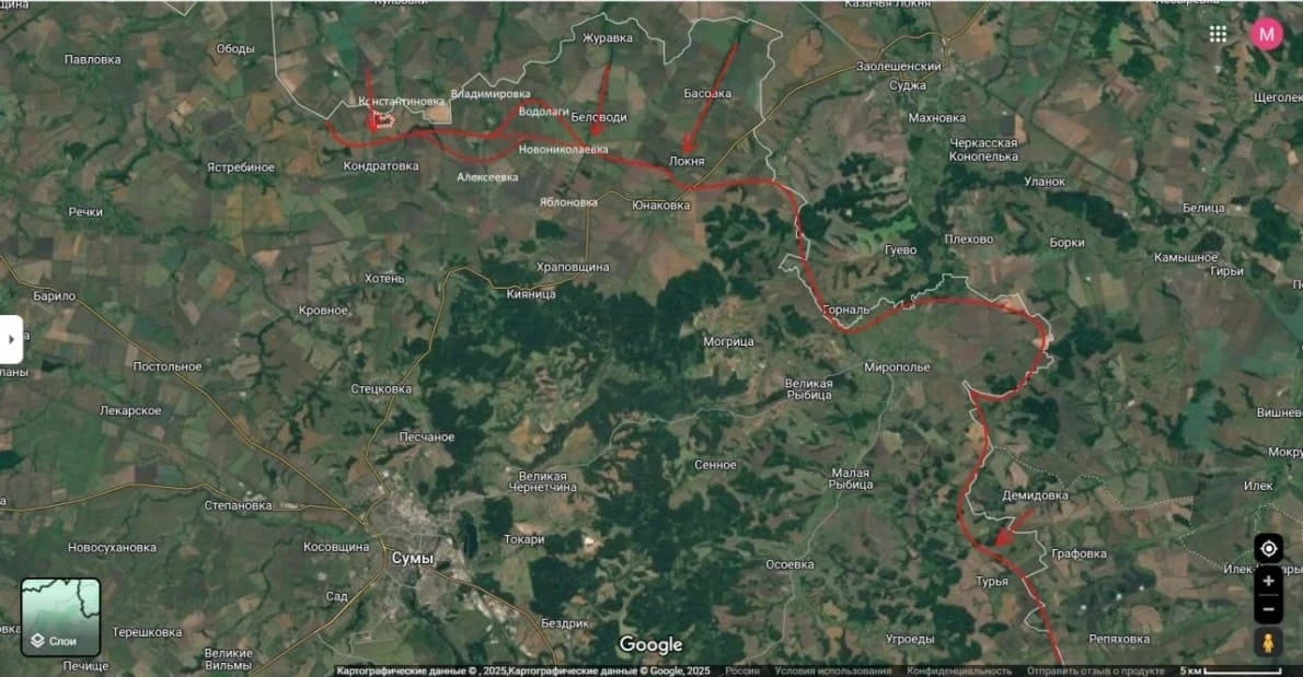 Блогер информирует, российские войска уже подошли к северным окраинам Юнаковки, что создаёт предпосылки для возможной дрон-блокады города. Он также обратился к гражданскому населению, призвав временно покинуть Сумы до разрешения ситуации.