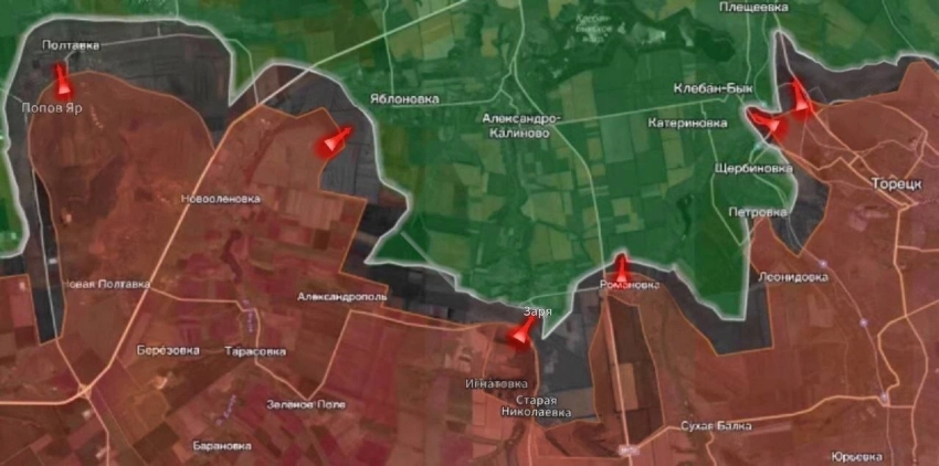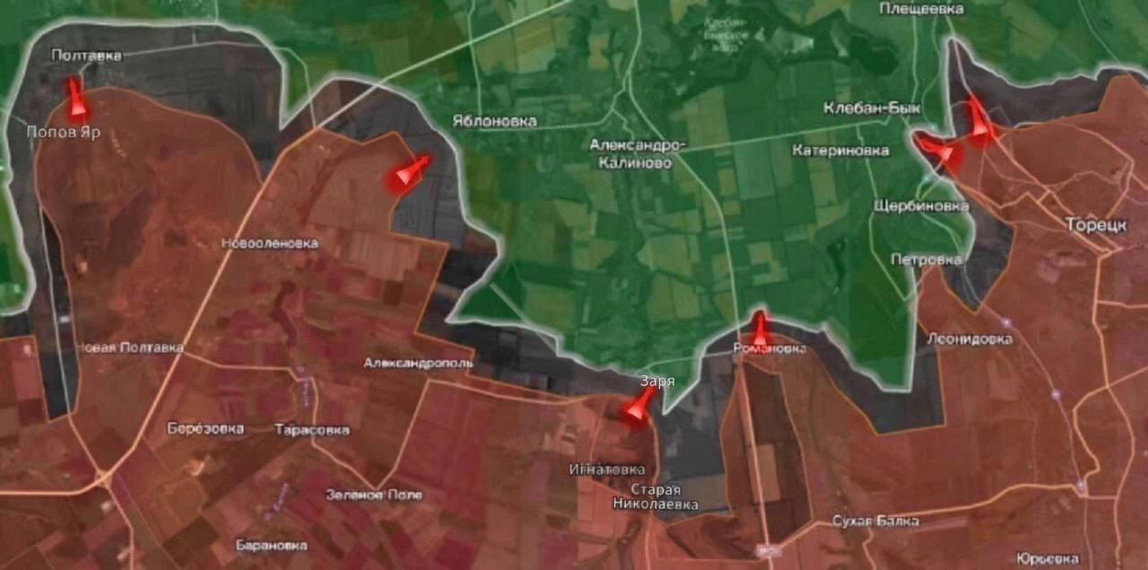 Между Мирноградом и Торецком бои не утихают на линии Попов Яр - Полтавка - Русин Яр. Особенно интенсивно в Яблоновке - наши продвинулись там в западной части на 400 метров. Идёт зачистка района Зари и южнее. К северу от Торецка выбиты украинские опорники вдоль трассы на Дылеевку и восточнее Озаряновки.