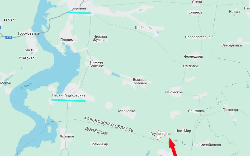 От Глущенково до крупного села Пески-Радьковские или соседней Лозовой, находящихся на берегу Оскольского водохранилища, около 10 км. Если ВС РФ пойдут в этом направлении, то бывший райцентр Харьковской области Боровая будет отрезан не только с севера, но и с юга.