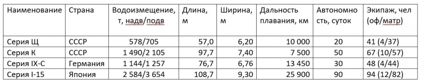 Японцы же изначально строили океанские подводные лодки. Большие и с прекрасными характеристиками. Я сейчас дам сравнения нескольких важных для нас параметров по сегодняшней теме: размеры, дальность плавания и автономность, поскольку именно от них всё и зависело в плане быта.