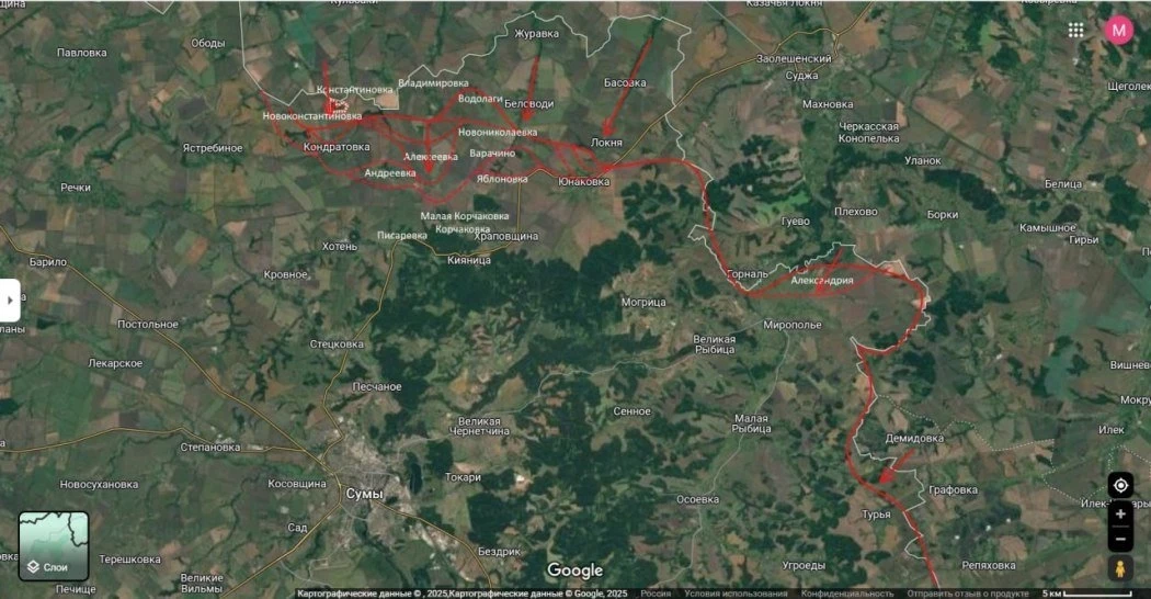 Российские войска имеют тактические успехи южнее Андреевки и Алексеевки, на северных окраинах Яблоновки и Юнаковки, продолжаются встречные бои. На фоне наступления ВС РФ киевский режим вынужден эвакуировать население более ста населенных пунктов в Сумском регионе, информирует "Военное обозрение".