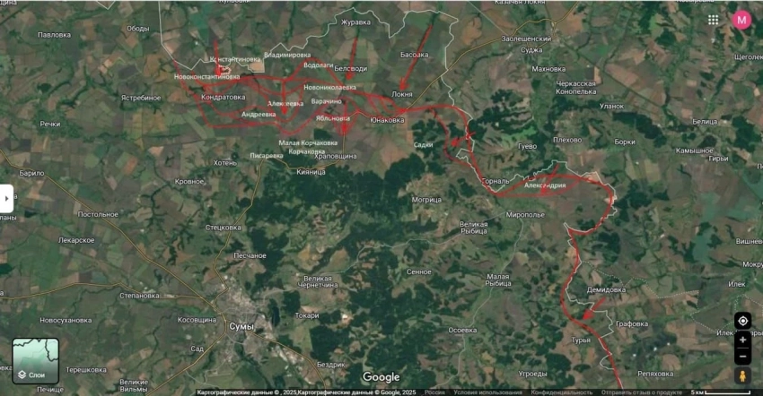 Юрий Подоляка в своём Telergam-канале информирует о том, что в сражении за город Сумы накал боёв нарастает. Армия России мощно наступает на позиции Вооружённых сил Украины (ВСУ) и каждый день освобождает новые территории.