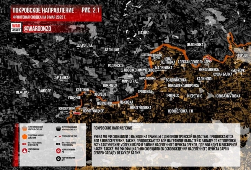 На Покровском направлении российские войска продвинулись северо-западнее населенного пункта Богатырь. Вчера МО РФ сообщили о выходе на границы с Днепропетровской областью. Продолжаются бои в Новосергеевке, также, продолжаются бои на границе областей к западу от Котляровки. Есть тактические успехи ВС РФ в районе населенного пункта Орехов, где бои идут в восточной части. Также, МО РФ официально сообщило об освобождении населенного пункта Заря к северо-западу от Сухой Балки, сообщает Telegram-канал Wargonzo.