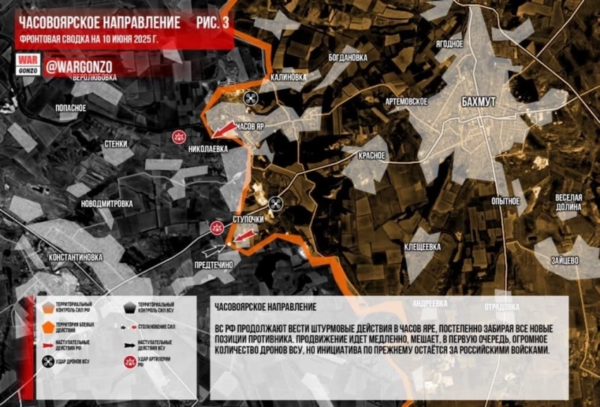 На ЧасовЯрском направлении ВС РФ продолжают вести штурмовые действия в Часов Яре, постепенно забирая всё новые позиции противника. Продвижение идет медленно, мешает, в первую очередь, огромное количество дронов ВСУ, но инициатива по прежнему остаётся за российскими войсками.