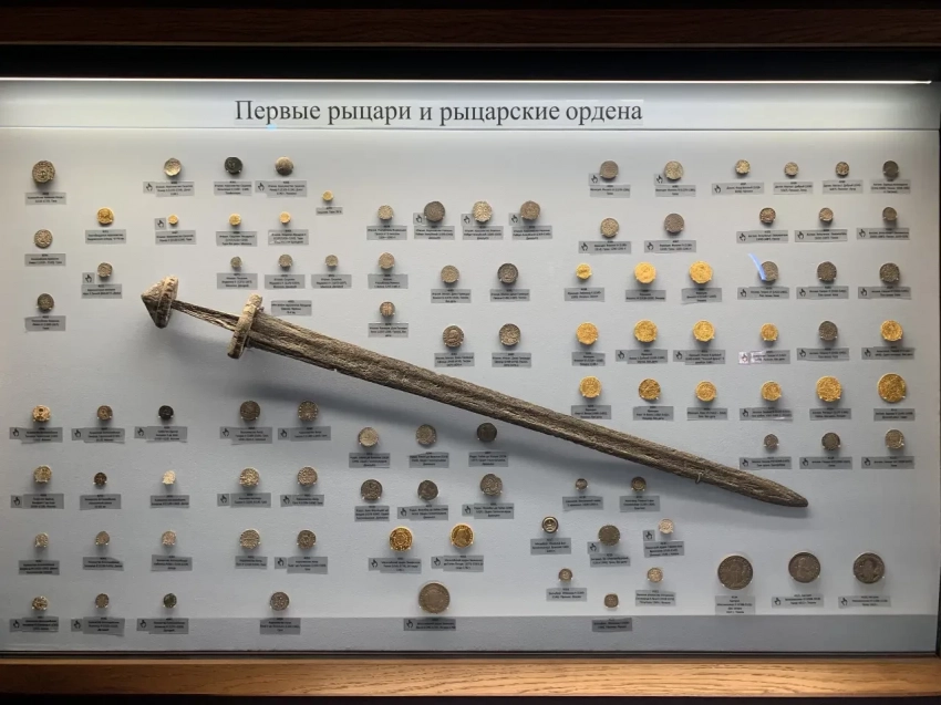Одна из монетных витрин выставки с мечом примерно X века (Тип II по Уилеру/Оукшотту) с характерным навершием и гардой…