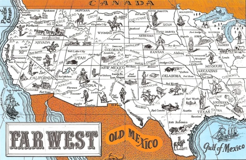 Карта «Дальнего Запада». Хорошо видно, как далеко благодаря речным пароходам могли добираться белые переселенцы…