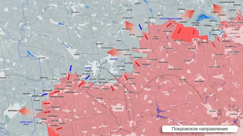 На левом фланге охвата Покровска бои в районе Новониколаевки и Удачного. На правом российские штурмовики заняли опорный пункт западнее Гродовки. МО подтвердило освобождение Малиновки - ранее центрального узла обороны ВСУ, соединяющего Покровск и Константиновку. Ближайшая цель наших войск на этом участке - взять Новоэкономическое и зайти с севера на окраины Мирнограда, примыкающего к Покровску. Тем временем наши бойцы продвигаются южнее, зачищают «карман» по рубежу Малиновка-Елизаветовка.