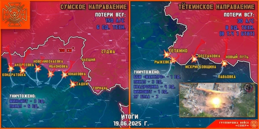Что касается Сумского направления, то здесь продолжаются попытки ВСУ наступления со стороны Рыжевки, Бессаловки и Искрисковщины в направлении Тёткино, Курской области, успехов не достигли.