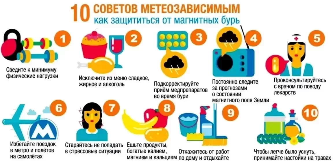 При этом эксперт также отметила, что во время магнитных бурь не следует лежать целый день, напротив, лучше выполнить легкую зарядку с утра для улучшения кровообращения. Также стоит отказаться от алкоголя и сигарет, а в пище отдать предпочтение легким белковым продуктам, свежей зелени и овощам.