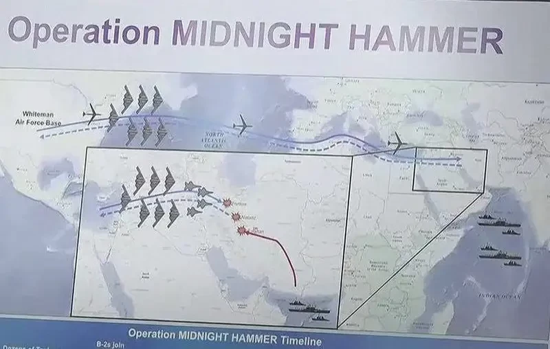 США провели операцию «Полуночный молот», задействовав в ней семь стратегических бомбардировщиков B-2 Spirit, взлетевших с авиабаз на территории Штатов и совершивших беспосадочный перелет до Ирана с дозаправками в воздухе. Удары наносились противобункерными бомбами GBU-57A/B MOP (Massive Ordnance Penetrator), причем это было первое боевое применение данных боеприпасов. Бомбами были атакованы ядерные объекты в Фордо и Натанзе, по Исфахану отработали ракетами «Томагавк» с борта американских АПЛ.