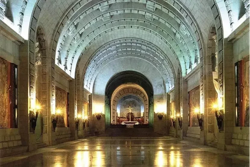 Длинный проход с боковыми капеллами и стенами, украшенными гобеленами и фресками с изображениями святых — покровительниц Армии, Флота, ВВС и Гражданской Гвардии, ведет к главному алтарю, у подножия которого ранее находились могилы Франсиско Франко и Хосе Антонио Примо де Риверы. Прямо перед входом в главное церковное пространство две огромные статуи ангелов с мечами охраняют вход, как ангелы Рая.