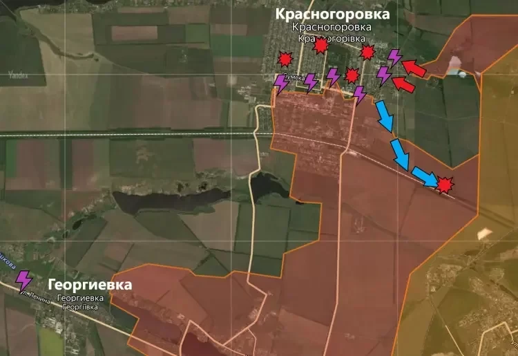 На Кураховском направлении штурм Красногоровки не останавливается. Продолжаются бои к северу от Красногоровского огнеупорного завода. Также подразделения ВС РФ давят с востока, информирует PulsePen. На западной окраине Георгиевки идут встречные бои. Наши бойцы уже несколько раз выбивали противника с его позиций, но сами закрепиться не могут. Причина проста - банально негде. Здания уж больно сильно разрушены.