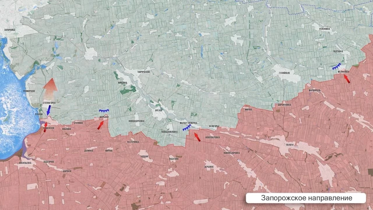 На Угледарском направлении ВС РФ продвинулись примерно на 1,5 км от Зелёного Поля в сторону Темировки, а также западнее Вольного Поля, расширяют зону контроля западнее Шевченко к Камышевахе, выдавливать ВСУ с востока на запад к Воскресенке. Чуть выше по фронту наши продвинулись к западным окраинам Мирного, которое ранее называлось поселком Карла Маркса, большая часть уже под нашим контролем. Ещё выше ВС РФ продвинулись к северо-востоку от ранее освобождённого Толстого, до 1 км в глубину и по фронту.