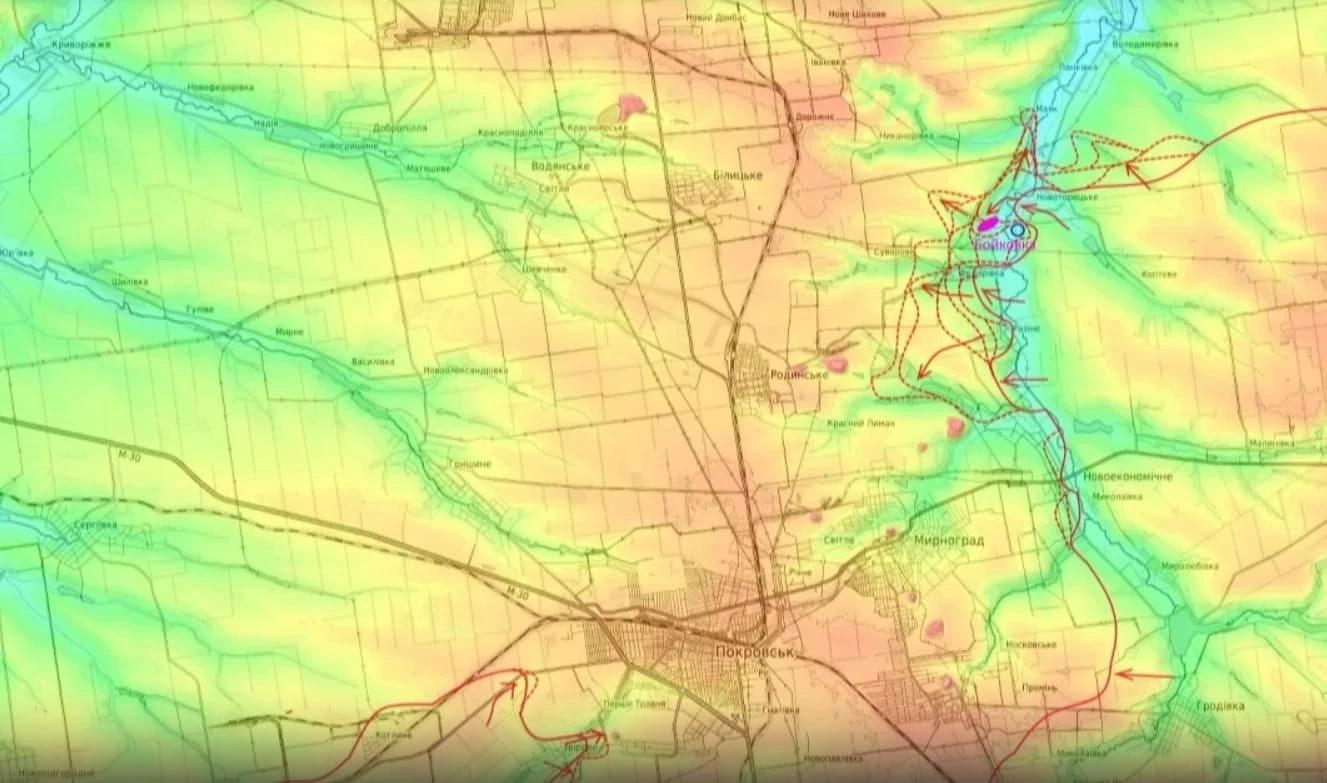 "В Экономическом наши войска продолжают грызть оборону противника, там работают 9-я и 5-я бригады 51-й армии и на сейчас они уже заняли до трети этого населенного пункта, надеюсь скоро мы тоже с ним покончим и таким образом обеспечим левый фланг наступления в тыл Покровской группировки с севера. Ну, а после занятия Маяка наши части попытаются скорее всего выйти на Паньковку, Владимировку и Шахово, чтобы таким образом уже обеспечить правый фланг наступления по обходу Покровска.