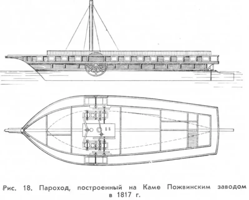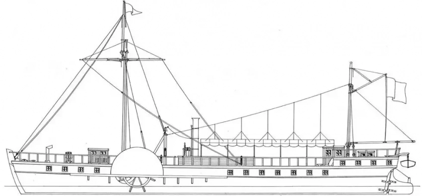 А вот это наш, российский пароход, построенный на Каме в том же 1817 году, но только вот как можно сделать его модель? Как выглядела его силовая установка и гребные колеса. Увы, кроме вот этой проекции ничего больше по этому пароходу разыскать не удалось!