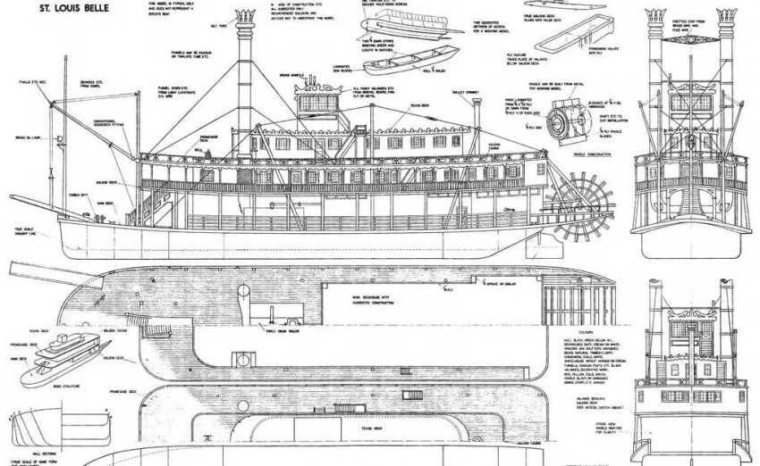 Кстати, если уж кто-то из наших читателей за оставшееся от лета время (и в отпуск) решит заняться постройкой модели «миссисипца», ему будет лучше использовать чертежи вот этого парохода: «Красавица Сент-Луиса». На мой взгляд, она более реалистична, нежели пароход из польского журнала. Тот очень уж какой-то узкий, а этот шире во всех отношениях. И паровые котлы с трубами под палубой на нем видно!