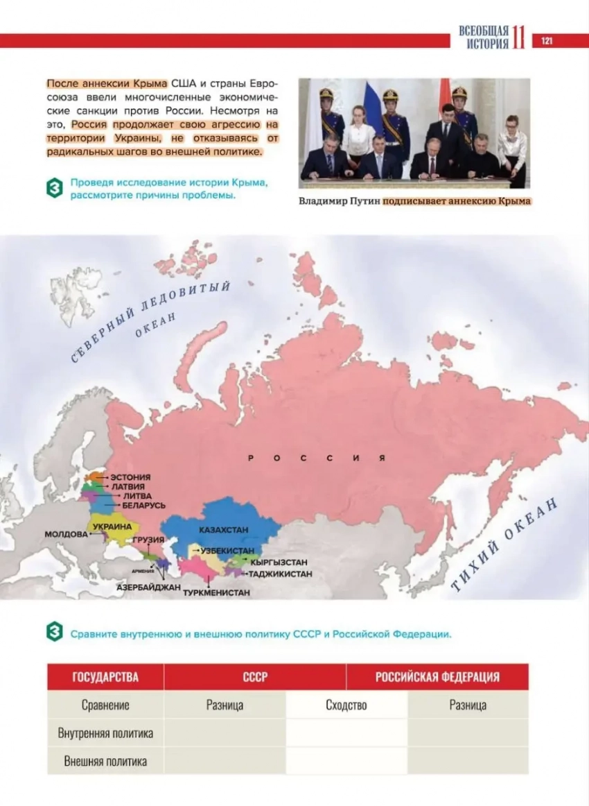 – указывается, в частности, в одном из учебников.Однако, как отмечает Дюков, на имперском и советском периодах авторы учебников не останавливаются, активно добавляя в изданные в последние годы учебники критику современной России. Передовиком в этом деле является Керим Шукюров, однозначно утверждавший в пособии для 11 класса (Баку, 2023) об «аннексии» Крымского полуострова в 2014 году и продолжении других «агрессивных и радикальных шагов» РФ в отношении Украины. Действительно, в данном учебнике есть такая цитата: