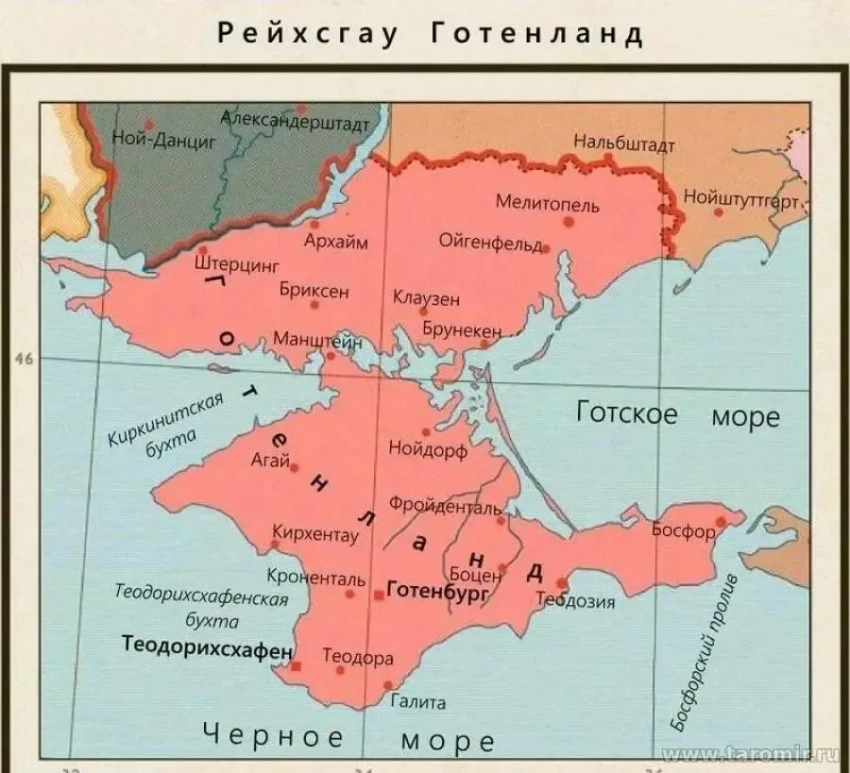 Вспомнить о древнем тевтонском государстве в Крыму приказал своим пропагандистам не кто иной, как Адольф Гитлер. Геббельс от идеи дистанцировался в силу полного непонимания, зато Гиммлер и Розенберг, как отмечено в «Застольных беседах фюрера» его секретарём Генри Пикером, готовы были оперативно очищать Крым от русских, евреев и татар.