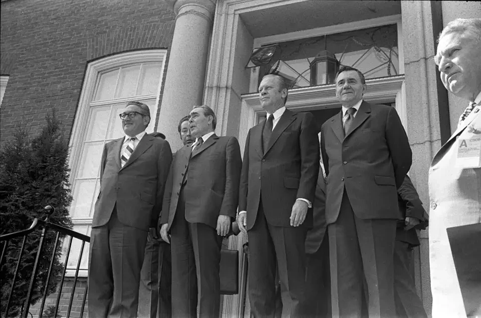 Президент Джеральд Р. Форд и генеральный секретарь ЦК КПСС Леонид Брежнев позируют на ступенях резиденции американского посольства в Хельсинки, в окружении госсекретаря Генри Киссинджера и министра иностранных дел СССР Громыко.