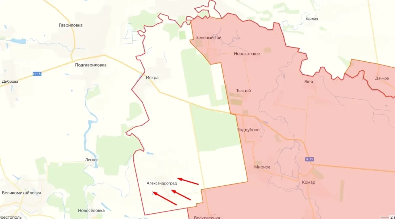 Российские околовоенные ТГ-каналы сообщают о штурмовых действиях наших военных в очередном населённом пункте ДНР, расположенном на границе с Днепропетровской областью. Речь идёт о селе Александроград, находящемся южнее Искры.