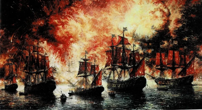 18. «Глянь-ка, что наши аржанушки чудесят!!!». Истребление турецкого флота русской эскадрой в Чесменской бухте в ночь на 26.6.1770 г. Холст, темпера, акрил, 100х185 см. 2014 г.