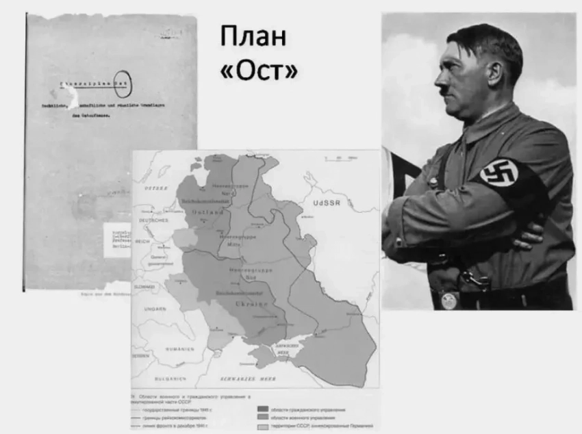 Перед Второй мировой войной перенаселенной Германии нужно было жизненное пространство и источники сырья. Генеральный план «Ост» (Generalplan Ost) был планом закрепления господства нацистской Германии путем нападения на Европу и СССР, предусматривал геноцид, а также принудительное выселение с территории Польши и оккупированных областей СССР значительной части населения и адаптацию завоеванных земель под свои нужды. Вспомним выступление Геббельса 22 июня 1941 года, то есть в день нападения нацистской Германии на СССР: «Это не война за трон и алтарь. Это война за зерно, железо, руду, уголь и сырье. Это война за сытый стол для немецкого рабочего».