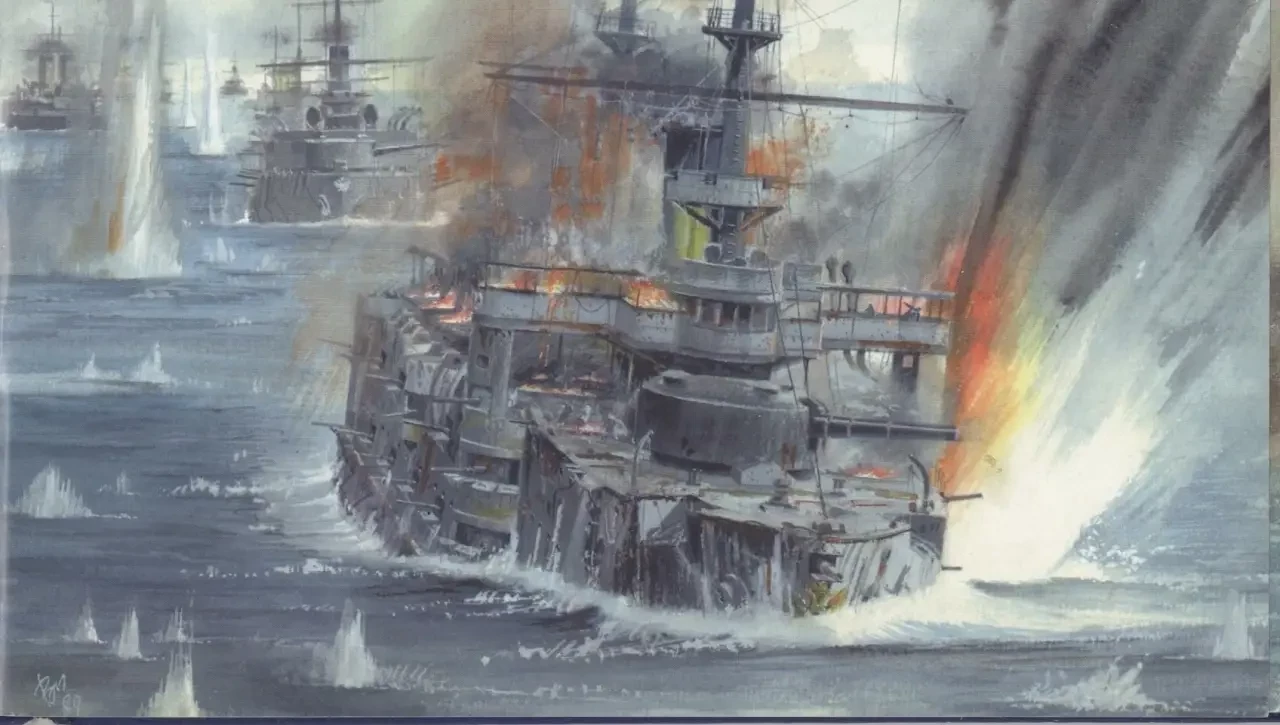 «После нескольких попаданий в броню борта напротив боевой рубки плиты стали отваливаться, как отсыревшая штукатурка, а в открывшийся незащищённый борт у самой ватерлинии попало два новых больших снаряда и сразу проломали целые ворота. Вода хлынула внутрь и быстро распространяется по скосу броневой палубы. Для заделки пробоины вызван рабочий дивизион во главе с инженером Змачинским, и пытаются закрыть дыру деревянными щитами, подперев их упорами. Однако волна вышибает брусья, и приходится работать по пояс в воде. Уже затоплена запасная угольная яма на скосе, отчего корабль и кренится».