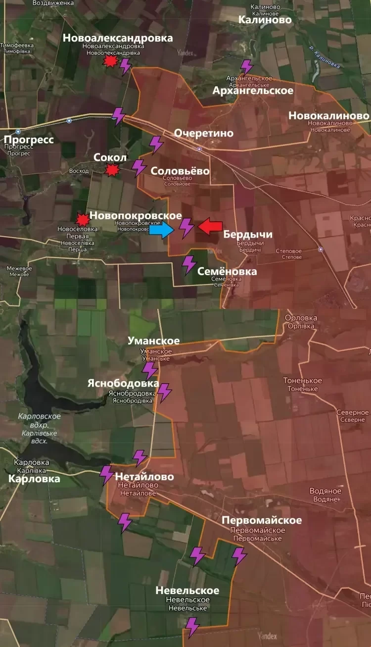 Подразделения ВС РФ продолжаются продвижение в разные стороны из Нетайлово. Наиболее существенное – на юг. Можно предположить, что оттуда Армия России двинется либо на запад - к Карловке широким фронтом, либо на юго-восток, отрезая группировку ВСУ к северу от Невельского.