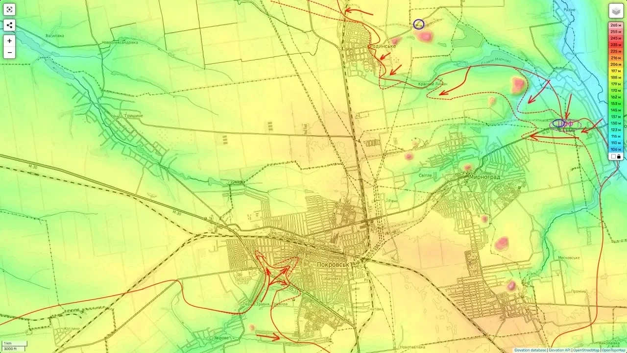Основной точкой боёв остаётся Покровск. Город, превратившийся в так называемый "слоёный пирог", по-прежнему не контролируется полностью ни одной из сторон. Внутри городской черты продолжаются ожесточённые штурмовые действия, где небольшие подразделения борются за каждый квартал.