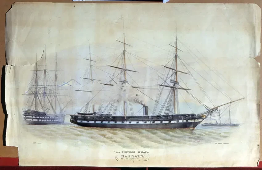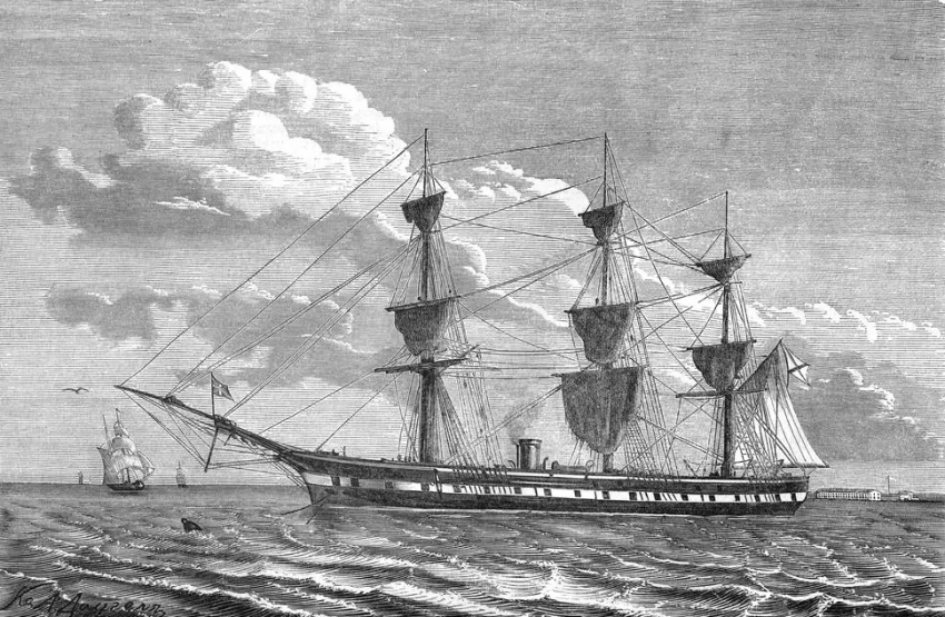 Фрегат стал прямым опровержением максимы капитана Врунгеля «как вы судно назовёте, так оно и поплывёт», но начнём с начала. Русское Морское ведомство заказало верфи «Колло и Компания» из Бордо фрегат и корвет в июне 1856 года. О корвете, получившем имя «Баян», я уже рассказывал, а фрегат по контракту должен был обойтись казне в 2800000 франков (каждый день задержки карался штрафом в 500 франков). Но Колло разорился и верфь продал инженеру Арману вместе с русскими заказами, а тот выставил дополнительный счёт ещё на 1130000 франков. Впрочем, сторонам удалось полюбовно договориться, и Арман получил ещё один заказ — на императорскую яхту «Александра» (впоследствии переименованную в «Штандарт»).