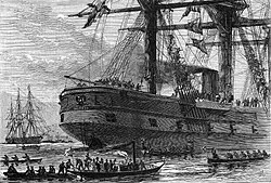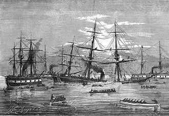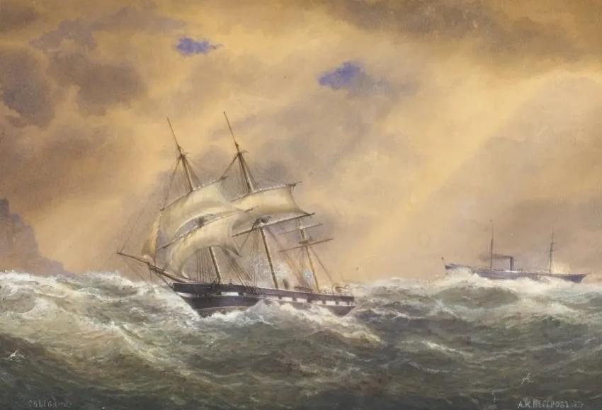 Выход из реки Тахо фрегата «Илья Муромец» на буксире парохода «Камчатка», худ. А. Боголюбов.