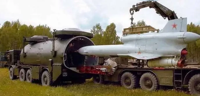 Погрузка беспилотного разведчика Ту-143 на транспортно-пусковую установку СПУ-143 с помощью транспортно-заряжающей машины ТЗМ-143