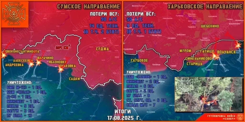 На Сумском направлении продолжаются сражения в районе Новоконстантиновки, Алексеевки и Варачино. В Юнаковке - тяжёлые бои.