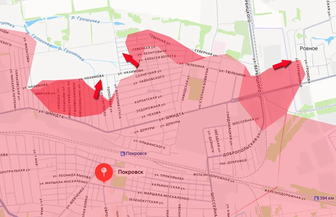 При учёте того, что сколько-нибудь массового бегства из Покровска гарнизона противника не фиксировалось, можно говорить, что большая часть сил ВСУ в городе была нашими войсками уничтожена. Часть переместилась по единственному возможному, но абсолютно бесперспективному, маршруту – в западную часть Мирнограда (на фото вверху).