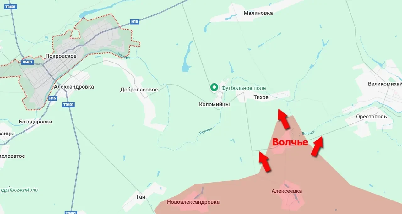 Продвижение на этом участке фронта составило более 3 км за сутки. Российские штурмовые группы при поддержке операторов дронов и миномётных расчётов продвинулись на север от ранее освобождённого села Алексеевка, переведя под контроль как само Волчье, так и участок автомобильной дороги Покровское-Орестополь. Это осложняет логистику противника и одновременно приближает ВС РФ к пгт Покровское – бывшего районного центра (Покровский район Днепропетровской области) был упразднён в 2020 году.