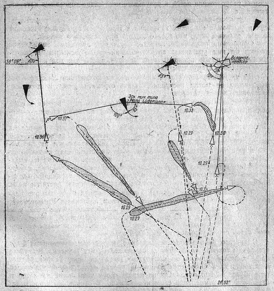 В 10 час. 32 мин. был атакован последней имеющейся торпедой эскадренный миноносец типа «Hans Lüdemann». Маневрируя под сосредоточенным огнем трех фашистских кораблей (в дневных условиях), командир катера действовал исключительно смело и разумно – атаковал два корабля и один из них потопил. Обращает на себя внимание тот факт, что, несмотря на интенсивный артиллерийский огонь противника, катер не получил даже царапины.