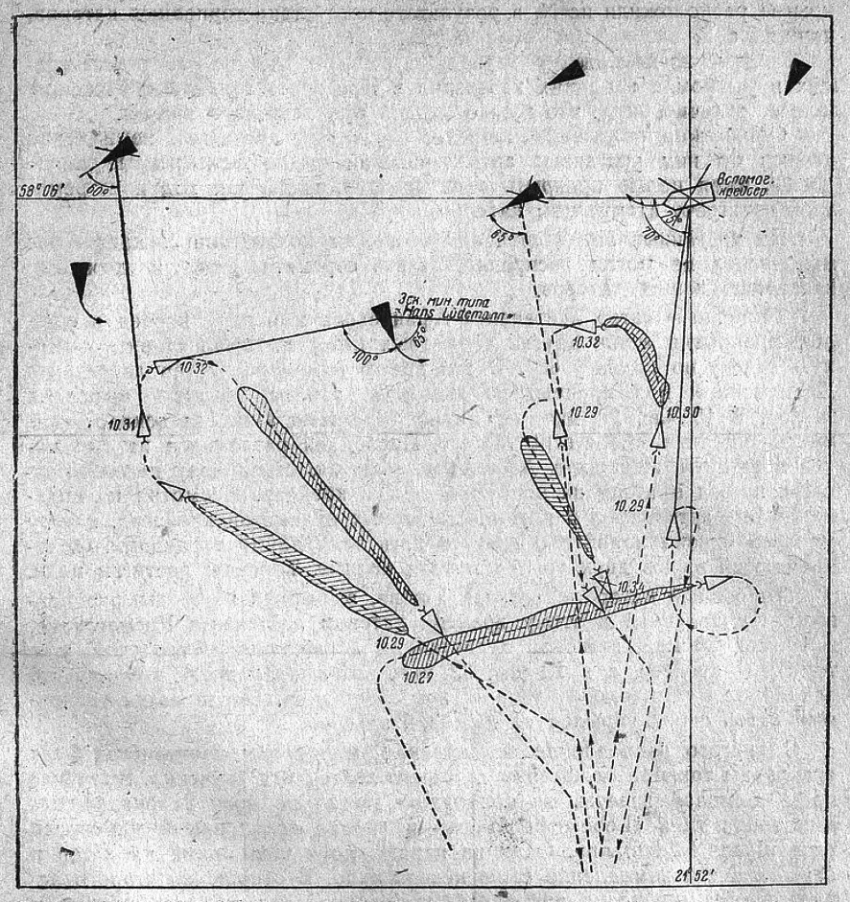 Схема атаки торпедными катерами немецкого вспомогательного крейсера и эскадренных миноносцев в бухте Лыу 27 сентября 1941 г.