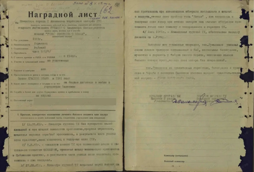 Герой Советского Союза легендарный моряк Владимир Поликарпович Гуманенко, его наградной лист и мемориал