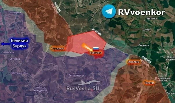 Российские войска перешли границу с Украиной на новом участке в Харьковской области севернее Купянска и закрепилась в селе Бологовка.