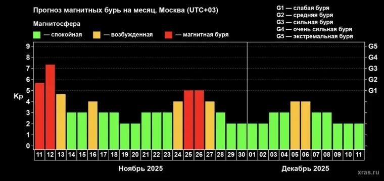 По оценке ученых, интервал между вспышками составит несколько часов, а пик активности может достичь уровня G3–G4. Это делает предстоящую бурю одной из сильнейших в году - ранее бури такого масштаба фиксировались лишь 1 января и 1 июня.
