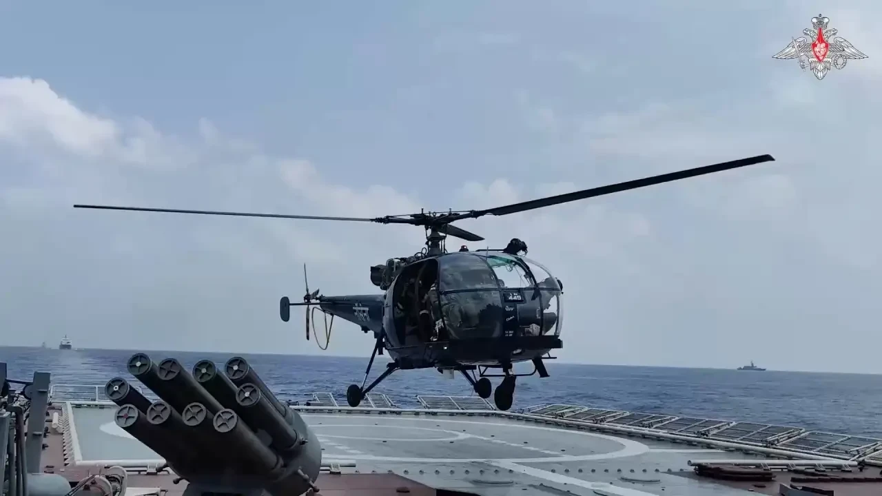 Индийский вертолёт совершает посадку на палубу российского корабля, учения Indra Navy 2025