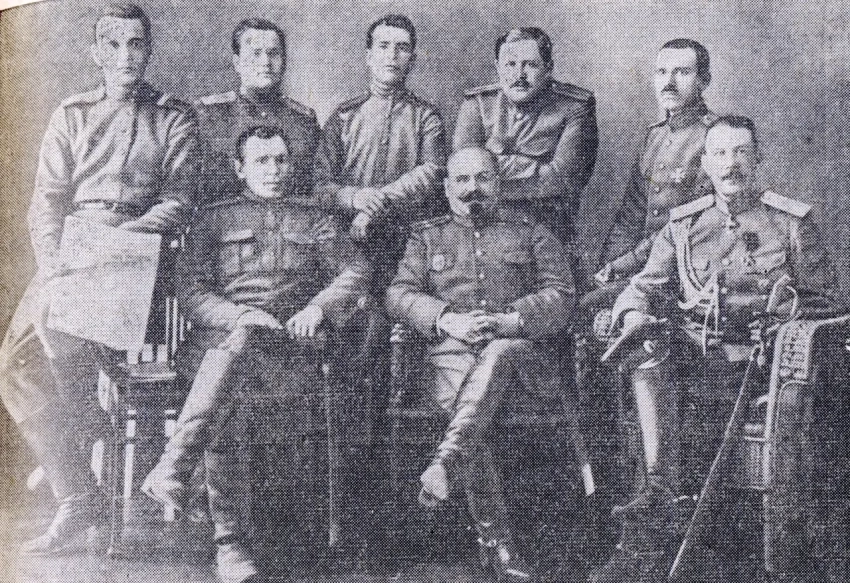 На этой фотографии 1917 г. мы видим членов Омского военно-окружного комитета и высших офицеров военного округа. А. Таубе сидит справа: