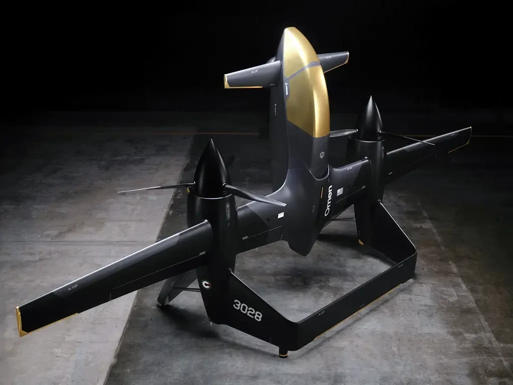 Omen получит гибридную силовую установку. В хвосте фюзеляжа помещается основной двигатель с генератором. Тип такого мотора не уточняется. Воздухозаборник указывает на возможность использования газотурбинного двигателя. В гондолах на крыле будут находиться два электромотора достаточной мощности. Им предстоит вращать трёхлопастные винты.